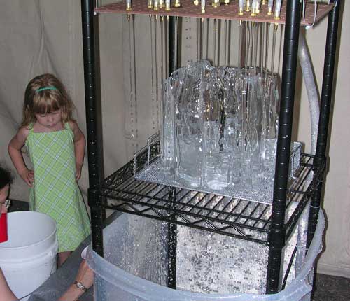 Automated Architecture RobotIra Spool and Anna TsypinArchitects have often searched for a more modern, technological or up-to-date way of designing buildings. This piece explores what is possibly the ultimate direction of architectural advancement: Having a robot direct the design. The Automated Architecture Robot creates a building design with organic, curved surfaces in one hour. The design is presented as a 1:50 scale model (Materials: Ice and light). The robot sculpts a block of ice into an organic form using water (The water is stored and recycled by the robot). Every 10 minutes the sculpting stops and the robot's water tubes move into their "stored" positions. Doors, windows and other architectural elements are projected onto the ice with a slide projector. Visitors can influence the outcome of the sculpted architectural model by making adjustments to a large control knob. They can choose between "Palatial Home," "Discreet Home," "Mixed-Use Development," "Company Branch Office," or "Company Headquarters." The robot will do its best to create the home/office of their dreams.
